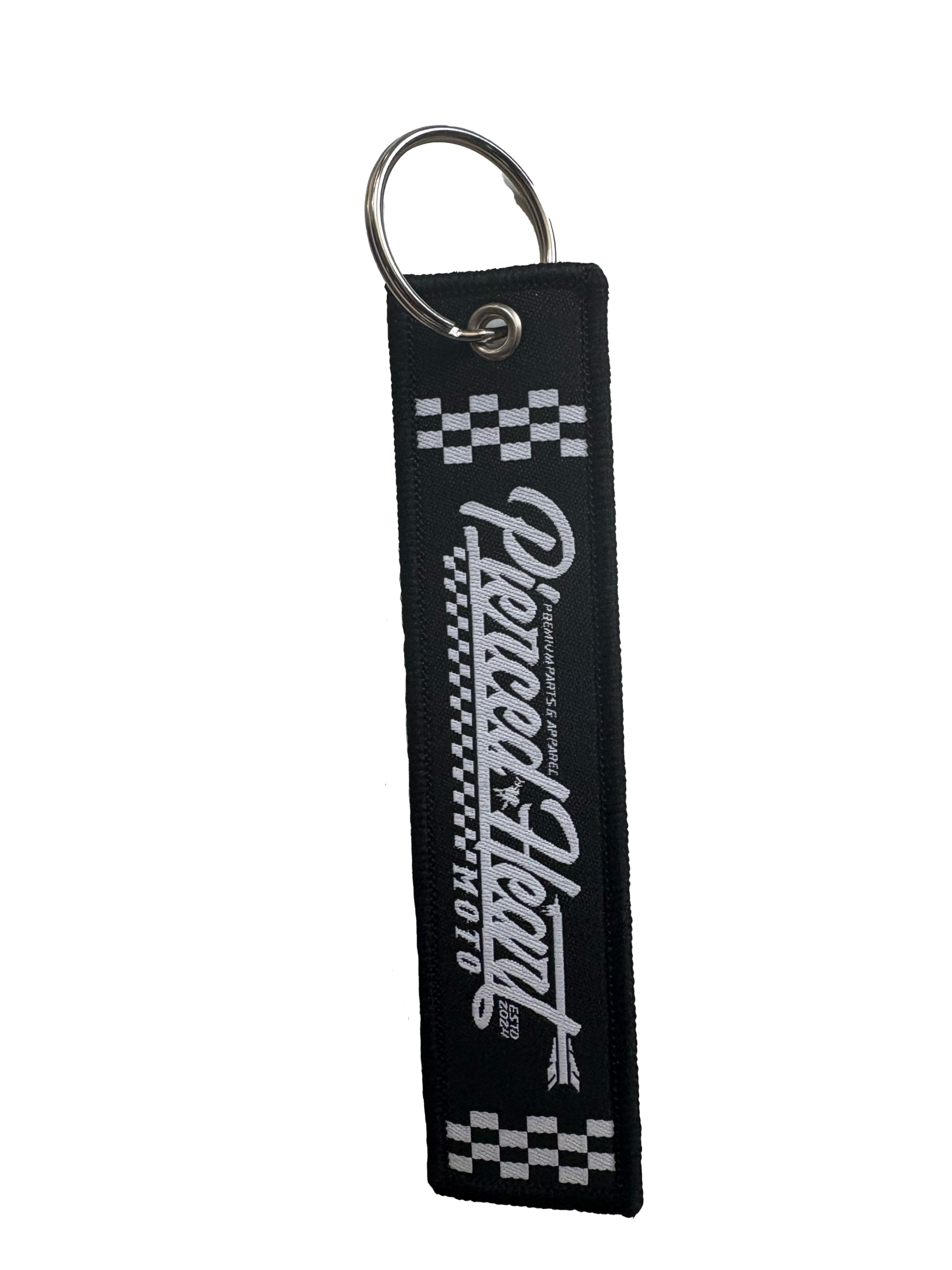 Our Pierced Heart Moto Keychain with text logo. Hang tag style stitched keychain tag. Black and white with our signature “text” logo.