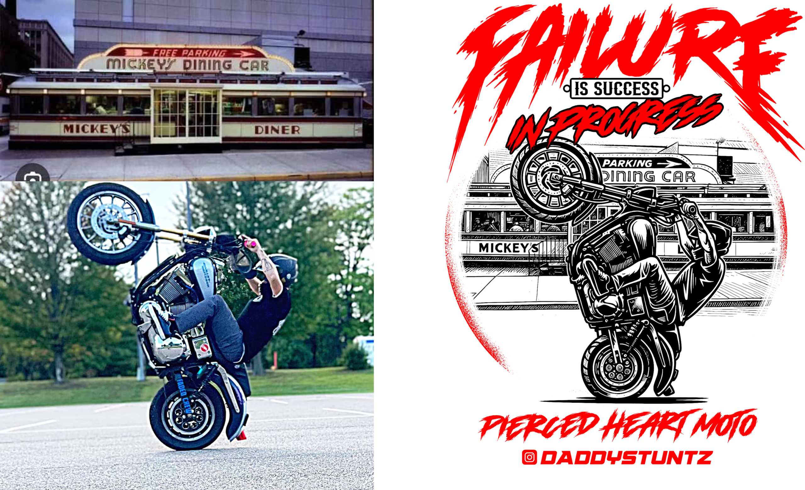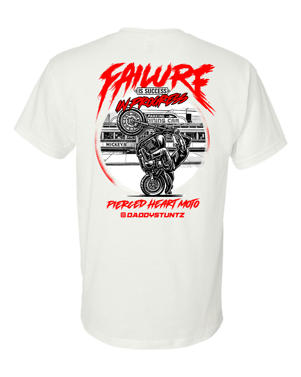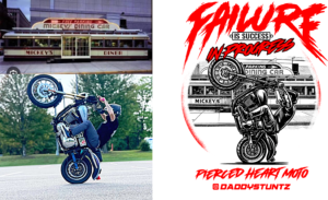 This shirt features a new Pierced Heart Moto logo on the front along with the artwork of DaddyStuntz actual riding picture on the back.. He also wanted us to incorporate Mikeys Diner in the shirt as well as a v twin on the front. This is the riders saying “Failure Is Success In Progress” and as always also includes our signature “wear your heart on your sleeve” heart P logo!