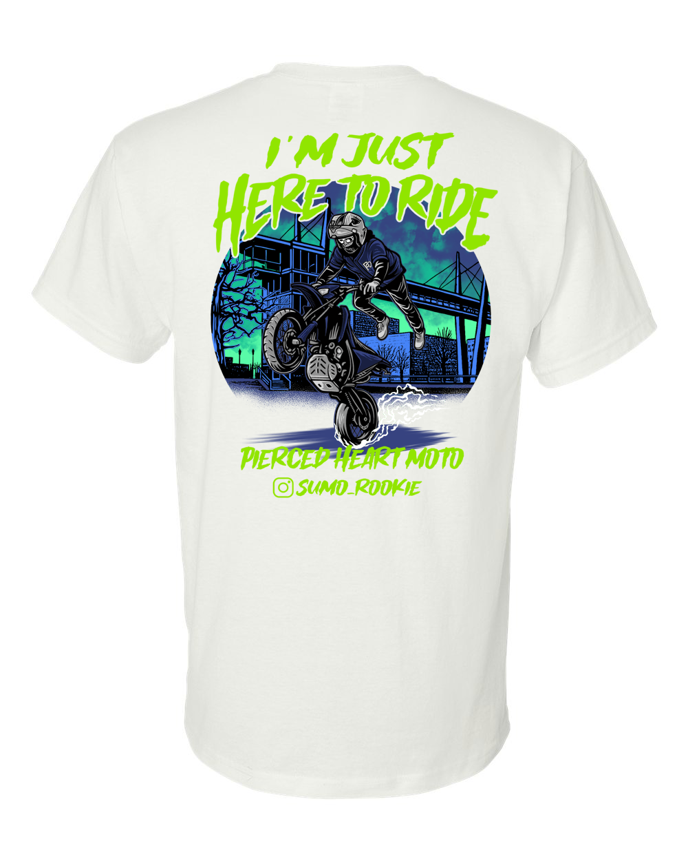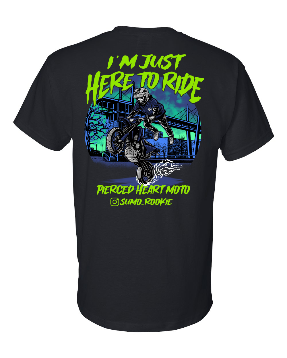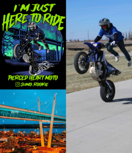 This shirt features a new Pierced Heart Moto logo on the front along with the artwork of Sumo_Rookie actual riding picture on the back. This is the riders saying “Im Just Here To Ride” and as always also includes our signature “wear your heart on your sleeve” heart P logo!