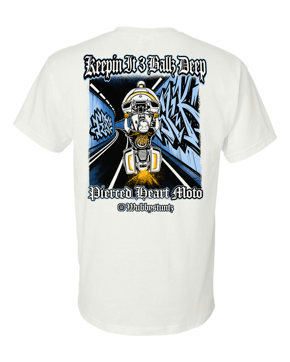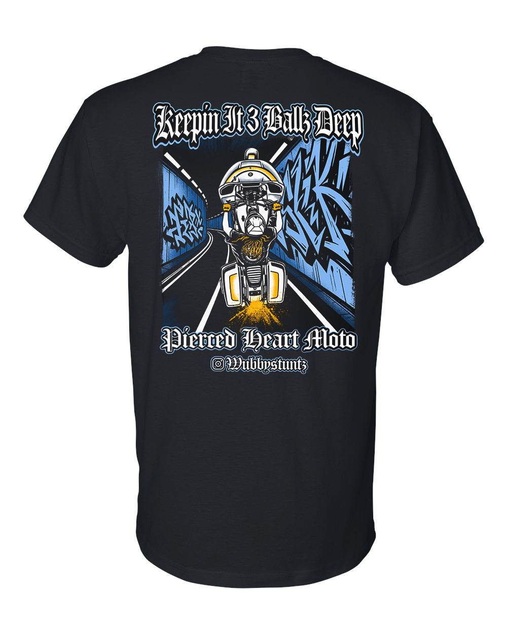 This shirt features a new Pierced Heart Moto logo on the front along with the artwork of WubbyStuntz actual riding picture on the back. This is the riders saying “Keeping it 3 balls deep” and as always also includes our signature “wear your heart on your sleeve” heart P logo!